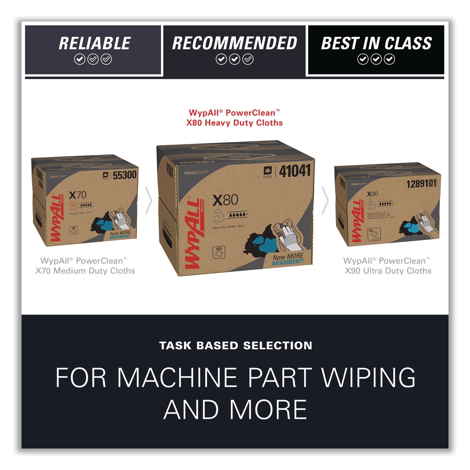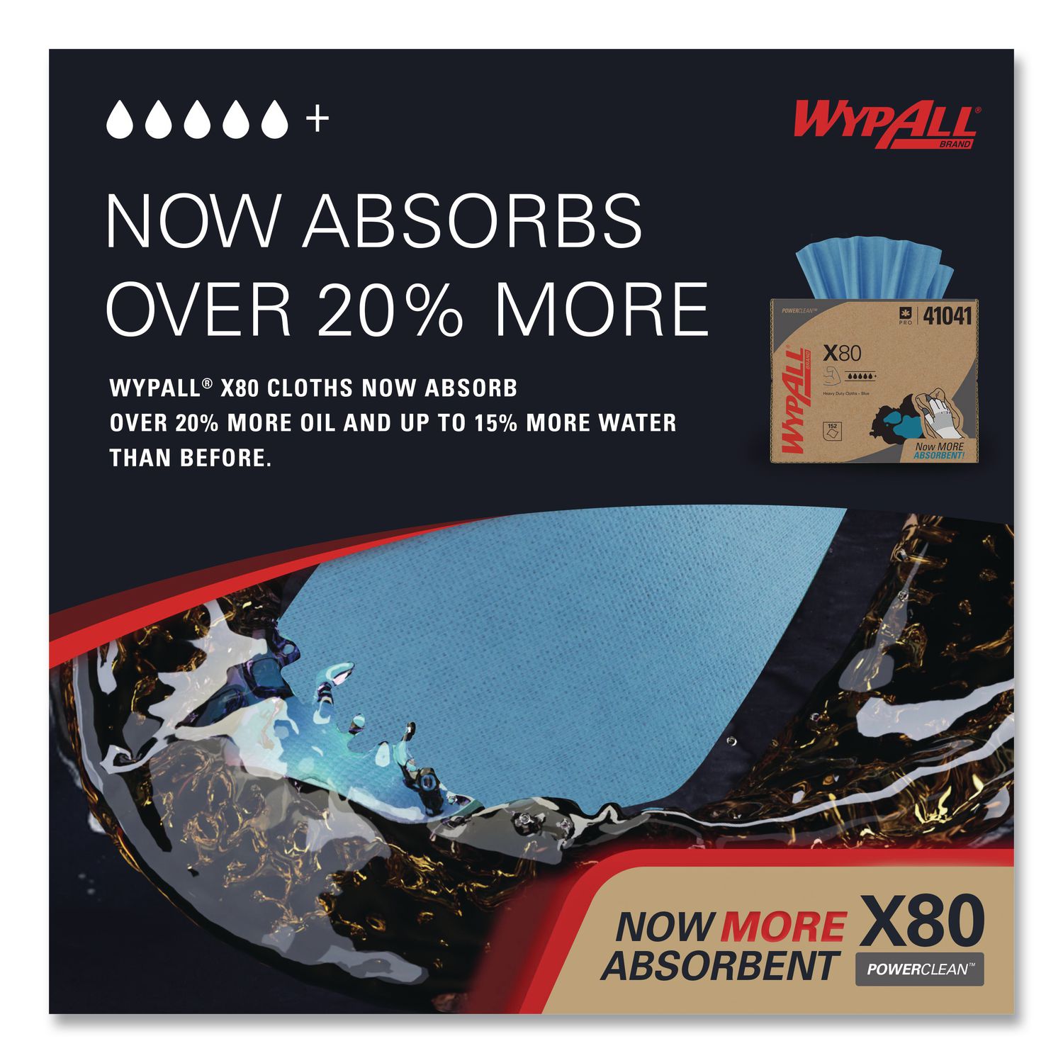 WypAll® is the number one brand of disposable wipes in the US and Canada. Maximize performance while minimizing time, effort and product waste. If you've been using industrial cloth towels, it's time to make the switch to WypAll® PowerClean™ X80 Cloths. These cloths feature innovations like high-tech Hydroknit® fast-absorbing material and are durable for scrubbing. WypAll® X80 cloths now absorb over 20% more oil and up to 15% more water than before. In addition, they now feature a tough, precision-engineered surface texture, making them even more effective for your cleaning tasks. The heavy-duty cloths are made of soft pulp fibers, bonded to a polypropylene base sheet for absorbency and durability, making them suitable for removing dirt, oil, grime and solvents in industrial and manufacturing businesses. The cloths are reusable and reinforced for strength when wet and dry. These bulk cloths are a great alternative – safer and more efficient – to replace laundered rental shop towels and cleaning towels. These premium industrial cleaning cloths can be used for heavy-duty machine and part wiping, wiping metal shavings, prepping surfaces with solvents, and cleaning rough surfaces. When you're running a business, it pays to use the very best supplies. For the toughest grease and grime, trust the performance and innovation of WypAll® PowerClean™ X80 Heavy Duty Cloths.